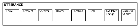 Utterance contextsConsider the sentence I love you. What changes in the interpretation of the words I and you when different speakers say this to different hearers? Each time a Speaker refers, there is a word (or more) that is uttered, that is, a form, and there is a referent, the thing that is being referred to. (Of course the referent may be something imaginary, but we can still talk about it existing in the mind of the Speaker.) But for each reference, there are always in addition several other things: the Speaker, one or more Hearers, the time and place of the reference, a set of things that the Speaker and the Hearer are currently aware of, and possibly some other language that has just been produced by the Speaker, the Hearer, or somebody else. A particular instance of language is an utterance. An utterance needs to be distinguished from a particular word, phrase, or sentence because an utterance has an utterance context, a particular Speaker, Hearer, time, place, available things, and recent language, in addition to its own linguistic form. I'll sometimes refer to the Speaker and Hearer as utterance participants. For example, we can put the English words I, like, and it together to make the English sentence I like it, but this sentence is a different utterance each time it is uttered. Each utterance has its own context, and, as we will see below, for each context the sentence has a different meaning. That is, meaning always changes from one utterance context to another. The figure below is one way of representing the elements of an utterance context. Each of the elements is a role in the context, a kind of slot that gets filled by something in each different situation. For example, the Speaker role is filled by a particular person, and the Location role is filled by a particular place. We will meet the concept of role again later in this book; in fact it is one of the most fundamental notions in cognitive science.