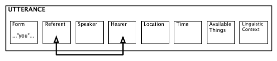 Now consider an approach to reference that is in a sense the opposite of that taken with proper nouns, which are completely independent of the utterance context, one in which the meaning depends completely on the utterance context. Say Clark is speaking to Lois and wants to refer to Lois. He could use her name, a proper noun. Or he could use a word which refers to the Hearer, whoever that might be. This is how the English word you works. Without knowing the utterance context, or at least knowing who the Hearer is, we have no idea what the referent of you is. The figure below illustrates the meaning of you. The referent of a you utterance is joined by the meaning arrow to the role of Hearer rather than to a particular individual (as for proper nouns) or a category (as for common nouns).