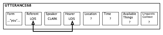 For each utterance of you, the word gets its interpretation from the utterance context, that is, who it is that fills the role of Hearer. So in our example, with Clark as the Speaker and Lois as the Hearer, the situation is as shown in the figure below. There are question marks in the Location and Time roles because we don't know what these are, and the number at the end of "utterance" is meant to indicate that this a particular utterance, not the general prototype for utterances shown in the previous two figures.