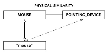 MetaphorConsider the use of the word web for the World-Wide Web and the use of the word root to mean 'source' (as in the root of all evil). What is the basis for these semantic extensions? What do they have in common? So far we've looked at how the meanings of words can be extended, both by adult speakers and by babies learning the language, in ways that make them more or less general. In this section we'll consider two other general kinds of conceptual relations that permit word meanings to be extended: similarity and various kinds of close association. First consider the situation that arose when computers were first outfitted with pointing devices to be manipulated in one hand by moving them across a pad and pushing one of their buttons. The noun that came to be used for these devices, mouse, was based on the resemblance of the devices to the animal: the general size and shape and the tail-like cable. Thus the meaning of the word mouse was extended on the basis of the physical similarity between one category (the animal) and another (the pointing device). Extension of a word's meaning on the basis of similarity is known as metaphoric extension. This figure illustrates the process.