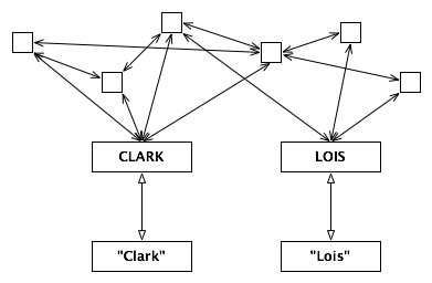 Does it make a difference which of these ways of representing the referent we go with? We'll see later that it does have some implications. For now, for the sake of simplicity, we'll assume the localist position, which is the one that is assumed (though usually not explicitly) by most linguists and by many other language scientists. The picture so far, then, looks like that in the figure below. The large rectangles are meant to stand for some person's representation of two individuals (clark and lois) and the forms of the words that refer to them ("Clark" and "Lois"). The arrows connecting the pairs of rectangles represent the form-meaning relationship. The small squares above the boxes are supposed to suggest all the different features associated with Clark and Lois (their height, their personality, etc.) and the different responses that this person might have to Clark and Lois. Some of these are also connected to one another because they tend to be activated together. Note that these are supposed to be features that are shared across different individuals, so one of them (maybe for hair color) is associated with the rectangles for both people.