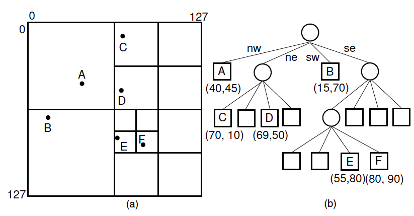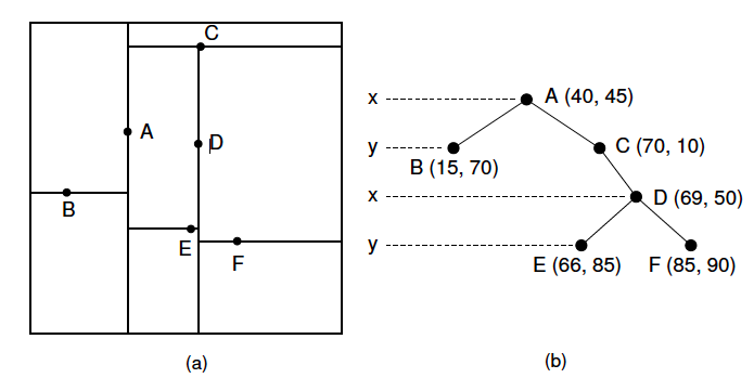 Figure 5 (Shaffer, Fig. 13.11). Example of a k-d tree. Each split is shown by a line, vertical for nodes with x discriminators and horizontal for nodes with y discriminators. The root node (line A) splits the space into two parts; its children further subdivide the space into smaller parts. -