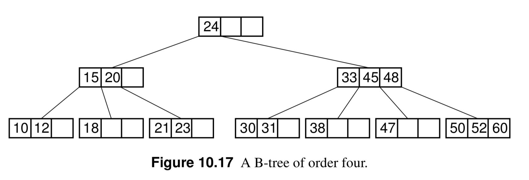 - each internal node, except for the root, has between $\lceil m/2 \rceil$ and $m$ children, for example: