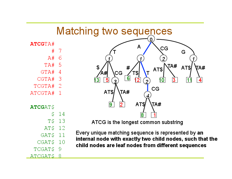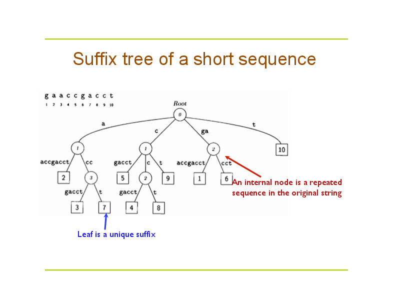- Suffix tree allows one to find, extremely efficiently, all distinct subsequences in a given sequence.